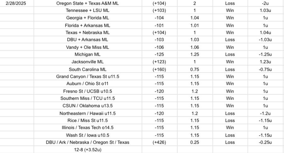 0.25u: Arkansas / Oklahoma / DBU / Kansas St / Michigan +478 ✅ 1.2u