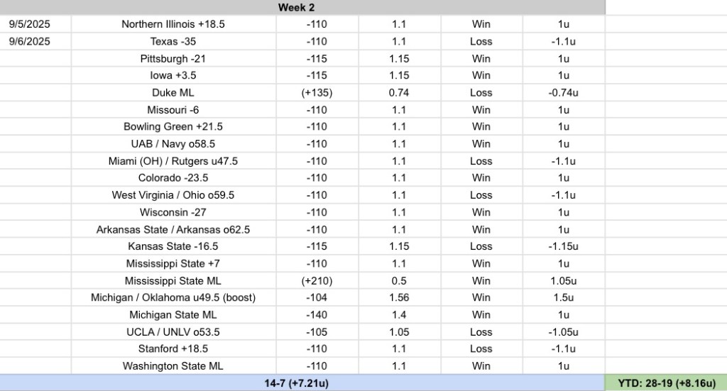 Big week! Missed the UCLA / UNLV over by half a point and Texas tried to cover on the final drive but fumbled inside the 10. We will take it.