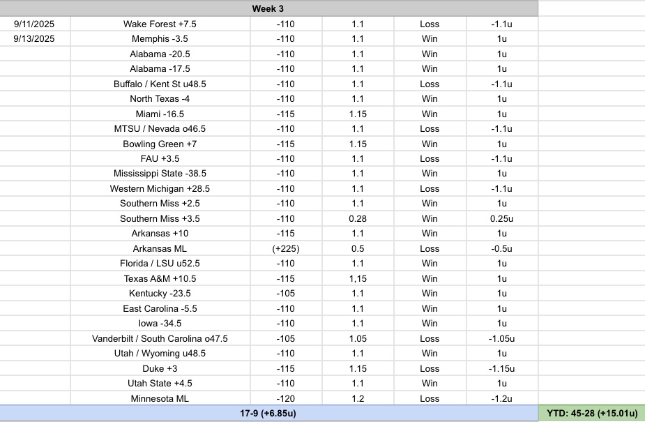 - SMU continues to regress as they fall to 0-3 ATS. 28 points and struggled at times against a bad Missouri State team. They will need to find it before heading to TCU this weekend.