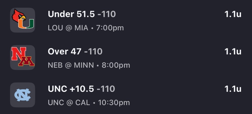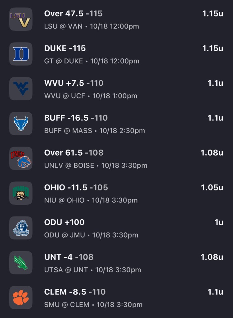 - Clemson QB Cade Klubnik is listed as probable with an ankle injury. Something to monitor but I expect him to play. Clemson has taken their foot of the gas the last two games. Against UNC, the Tigers had a 35-3 lead before ending 38-10. Last week against BC, they had a 34-10 lead at half before ending 41-10. UNC & BC are not good football teams, but it was encouraging to see Cade and the offense hang a large number in the 1st half. Dabo needs to feed the home crowd a good performance here as they are 1-3 in his last 4 home games and the one win was a struggle against Troy in week 2. SMU has won 19 consecutive regular season conference games. The Mustangs have been overrated by the market this season, as they finally covered their first spread of the season last weekend against Stanford. TCU’s Josh Hoover and Baylor’s Sawyer Robertson torched this secondary through the air. Outside of those, SMU has faced minimal passing threat in East Texas A&M, Missouri State, Syracuse (no Angeli), and Stanford. Clemson stays hot 34-20.