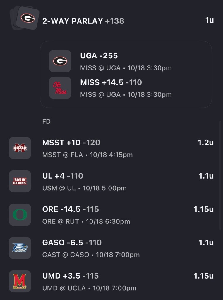 - I bet this on FanDuel. You can use a boost to get better odds, but I will list the price without the boost. I almost bet Georgia -6.5 on Sunday as I think this is a spot to sell Ole Miss. Sleep walking through the Washington State game post-bye week was not a good sign, but they were likely looking ahead to this matchup. The Rebels defense ranks 122nd in EPA/rush, which could be a concern on the road in Athens. This will also be QB Trinidad Chambliss first road start. Georgia has been a tale of two halves. They have been the best 2nd half team in the country. Kirby does a great job of making adjustments at the break and executing. Georgia’s defense ranks 84th EPA/Pass and struggles to generate a pass rush. Ole Miss offense ranks 23rd EPA/Pass. I believe Chambliss can toss it around to keep up. UGA 31-24.