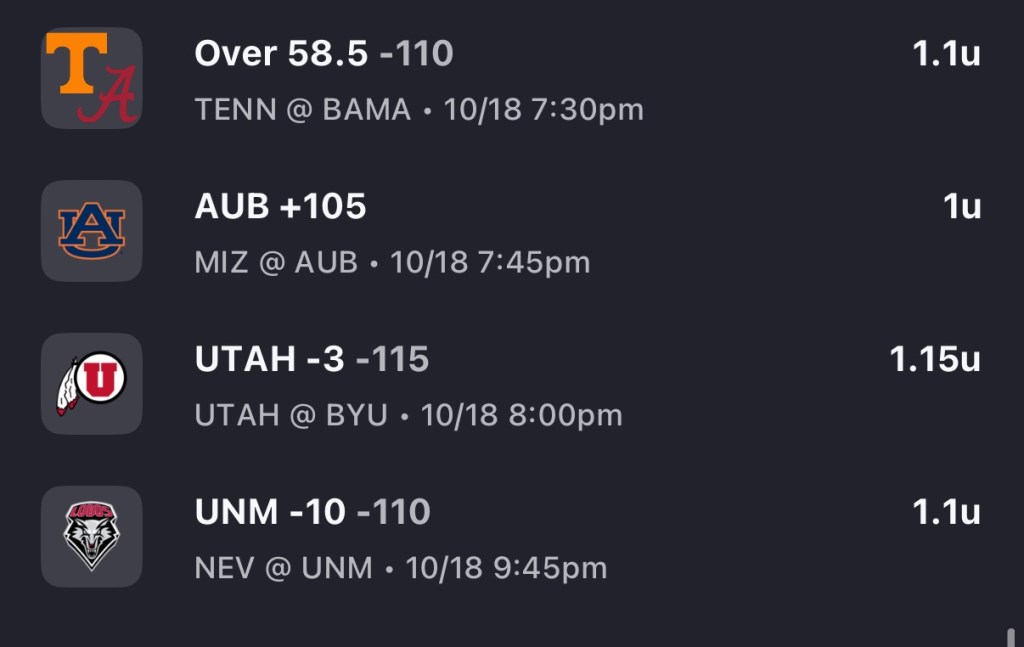 - I was waiting to see if a 57.5 ever came available, but I don’t think it will happen. Who doesn’t love the third Saturday of October matchup between the Vols and Tide? The last 3 matchups have been electric. I see a window for both offenses to find success in this game. Alabama’s defense has struggled with explosive runs, as they rank 74th in EPA/rush. Tennessee is averaging 5.4 yards per carry. In last week’s game against Mizzou, I thought the Tigers found success through the air with tempo as Bama was keyed in on stopping RB Ahmed Hardy (They shut him down). We know Tennessee’s offense will bring the tempo and pressure. Joey Aguilar’s preseason concern was interceptions; however, I believe he has done a good job only throwing 5 and some of them were not his fault. You have to take care of the ball if you expect to win this game. The Vols have 3 fast, dynamic WRs in Brazzell, Staley, and Matthews. According to Vols insider, Jordan Moore, Heupel has all but abandoned the Veer & Shoot offense against P4 opponents. It has been modified and upgraded. On the other side of the ball, I do not see Tennessee stopping Alabama’s WRs. The Vols rely on pressure and turnovers on defense. It is an aggressive approach, but it leaves massive holes whenever it isn’t working. They forced two turnovers against Arkansas, but TN’s offense failed to capitalize. Vols CB room has been banged up all season with McCoy and Gibson out. Bernard, Williams, and Horton will be open. They may be able to get pressure early against this Bama OLine, but it should be a quick, easy fix for Bama OC Ryan Grubb. Stats show that teams have adjusted to Tennessee’s defense well as the game progresses. RB Jam Miller is listed as probable which is huge as he is a big part of their pass protection. QB Ty Simpson has taken himself from hated week 1 to Heisman favorite and projected #1 overall pick. I will say the Vols are due for some positive regression on 3rd down, but I’m not sure this is the week. If Tennessee cannot get pressure on Simpson, I am confident Alabama will hang a large number. My cigar is ready, but I have a feeling I will not be smoking it. Bama 38-31.