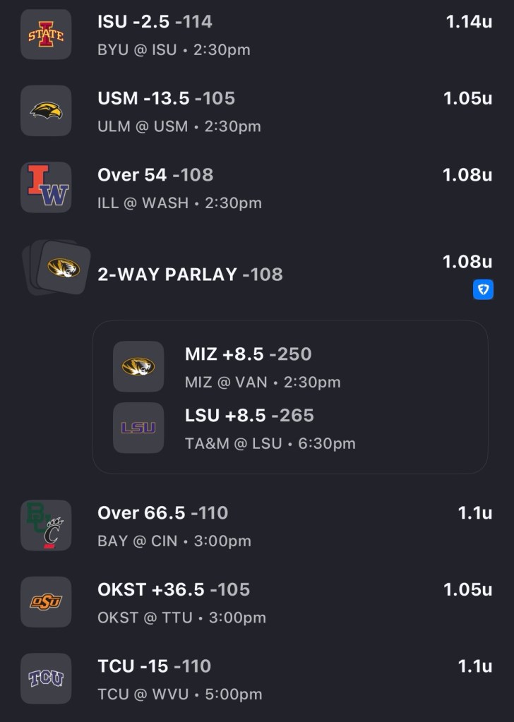 - I usually avoid overs in the mid 60s, but I am having a tough time finding a way for this to stay under. Baylor has found themselves in a shootout in 5/7 games this season. Cincinnati’s offense has scored 34+ points in 5/7 this season. QB Brendon Sorsby leads a Cincy offense that ranks 4th in EPA/Pass, 25th in EPA/rush, and 9th in offensive success. Take away the Samford game and Baylor’s defense is allowing 35.5 PPG. On the other side, Baylor’s Sawyer Roberson leads the country in passing yards. Cincinnati was torched through the air by Rocco Becht (314/2/2) and Jalon Daniels (445/4). I believe we see a classic Big 12 shootout here. The Baylor/TCU game started slow last week before sailing over the total. We should see plenty of explosives as both teams rank top 25 in yards per play. Cincy 38-34.