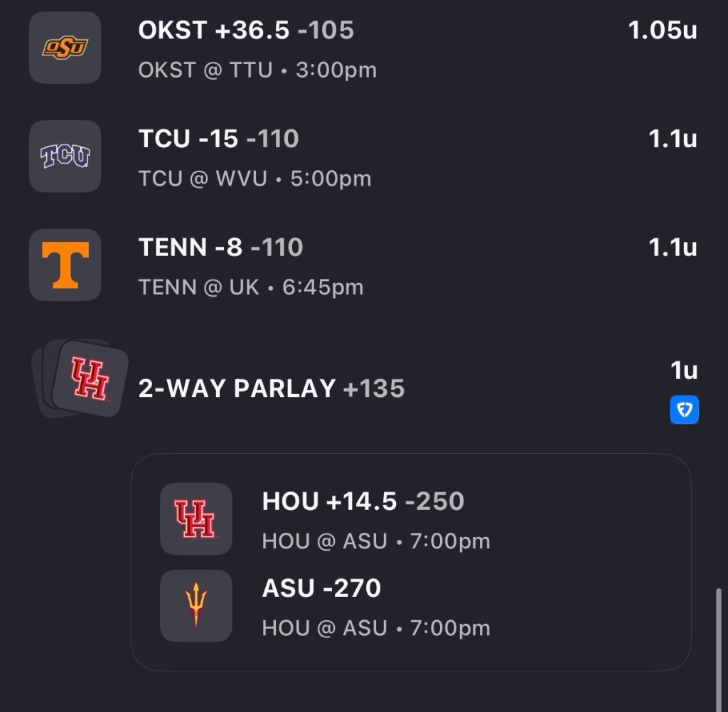 - Bet on FanDuel for best odds. We saw this middle hit last weekend with Ole Miss/Georgia ending 43-35. Arizona State is without WR Jordyn Tyson in this game and it will be a massive loss. To put it into perspective, Tyson has 57 receptions for 628 yards and 11 TDs this season. The rest of the WR room has only racked up 322 total yards together. The last WR to catch a TD pass for Arizona State was against Texas in last year’s playoff. They do not have a replacement on the outside, but I am not sure they will need it. State will have to run the ball effectively while heavily using RB and TE in the receiving game. Sam Leavitt is a good QB and Kenny Dilligham is a great coach. I believe they can adjust without their top weapon in the lineup. Houston’s rushing attack finally found success last week against Arizona. Willie Fritz has done a great job this season; however, The Cougars have played the weakest schedule in the Big 12. I would be surprised to see them walk into Tempe and win despite the Tyson injury. I don’t see either offense finding a ton of success. Arizona State should be able to do enough to win this game. I wouldn’t mind if you wanted to take Houston +7.5 or +10.5 with Arizona State ML as well. 24-20 Devils.