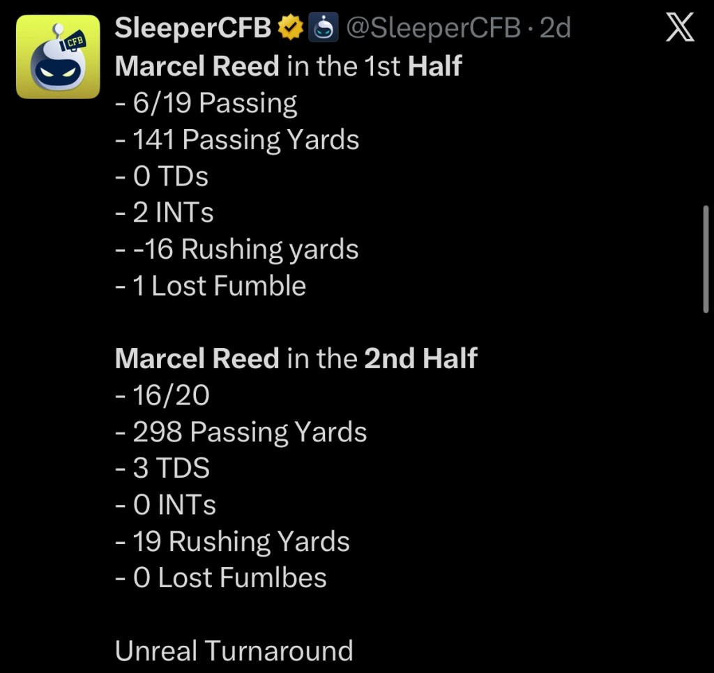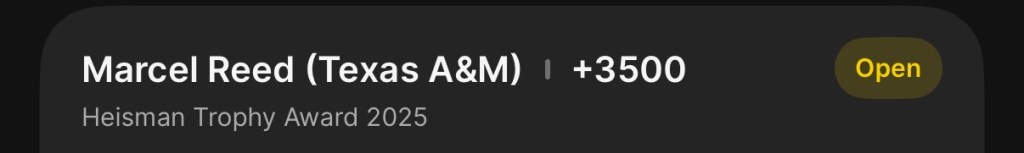 Marcel Reed almost killed my chances with that first half, but luckily he decided to wake up for the 2nd half. Reed finished with 439 passing yards with 3 passing touchdowns during the comeback. He now sits at +550 to win the Heisman, officially entering the race with Mendoza (-105) and Sayin (+170).