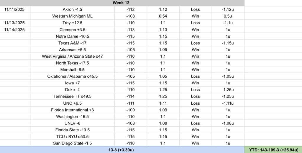 Week 12: 13-8 (+3.39u)