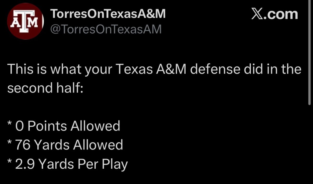An impressive 2nd half come-back from Texas A&M after being down 30-3 at halftime. The first half was one of the ugliest halves of football I have seen this season. With zero room for error in the 2nd half, the Aggies dominated. Marcel Reed