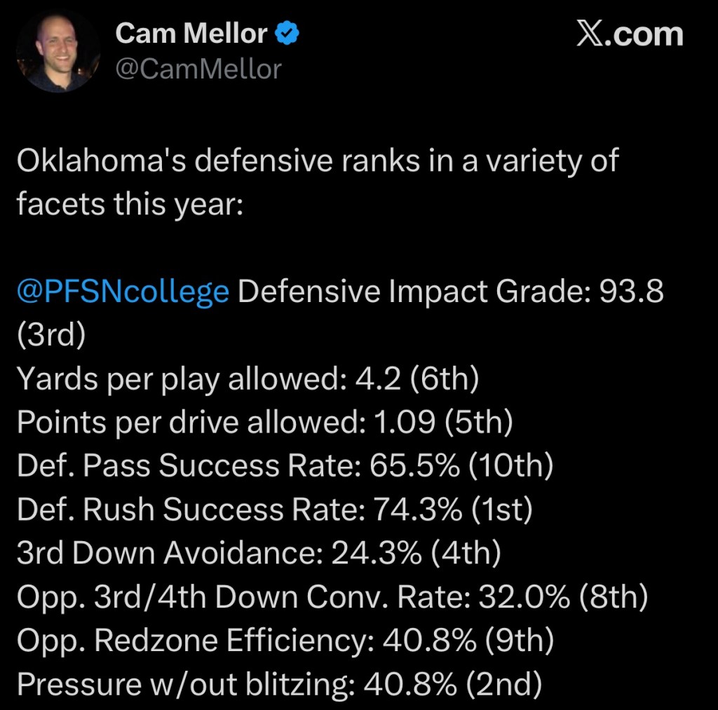 Oklahoma finds a way to win at Alabama despite being out-gained offensively by over 200 yards. Mateer was held to his lowest passing total of the season. OU’s defense is an elite unit, forcing 3 turnovers with one being a pick 6. The Sooners will lock up a playoff spot with home wins over Missouri and LSU and the Iron Bowl now becomes a must win for Alabama.