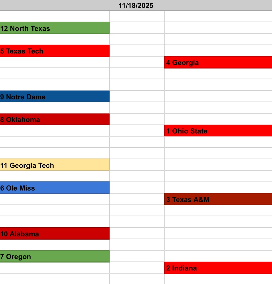Texas A&M, Georgia, Alabama, Ole Miss, Oklahoma, Ohio State, Indiana, Oregon, Texas Tech, ND, Miami with BYU/Utah/Vandy/USC fighting for the last 2 spots.