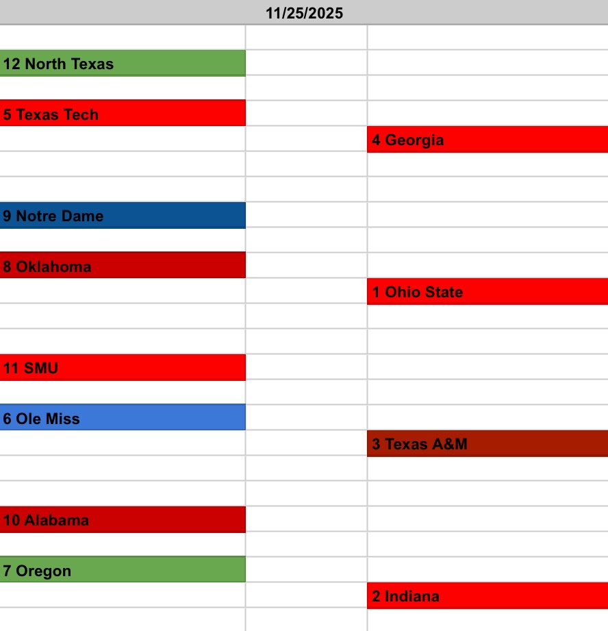 Oklahoma finds a way again despite getting out-gained offensively. John Mateer 14/30, 173 yards, 2 TDs (87 yards in one big play). The Sooners have an elite defense. -420 to make the CFB Playoff