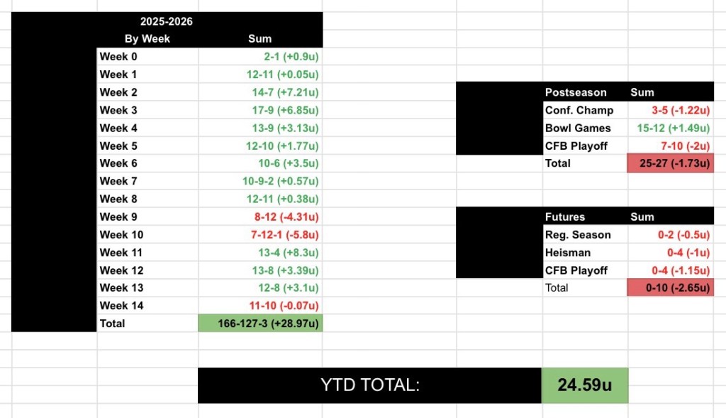 - Future tickets come up empty but North Texas +3000 to make the CFB Playoff and Marcel Reed +3500 to win the Heisman were good rides.
