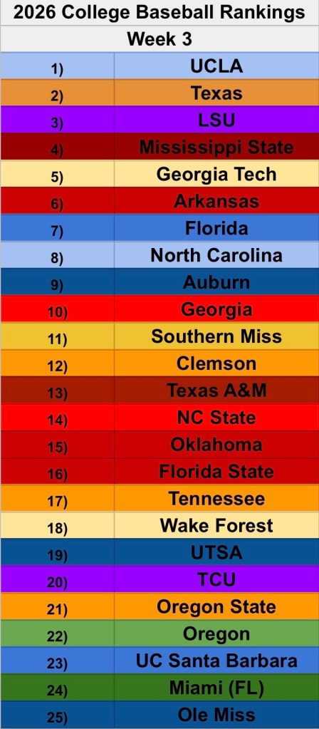 UCSB cracked my top 25 after a sweep over Utah. The Gaunchos impressed me opening weekend against Southern Miss. They are up to #3 in RPI, but it will likely drop over the next few weeks with Big West play.